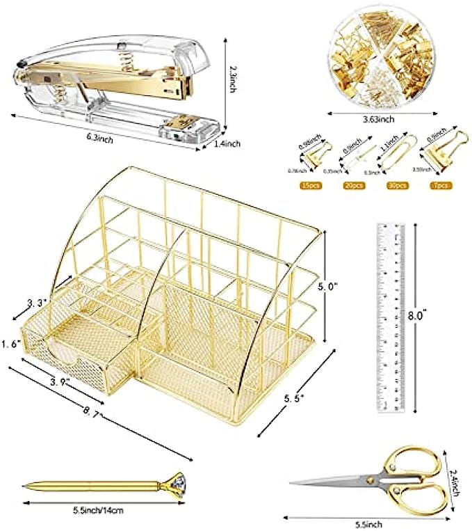 Gold Desk Organizers and Accessories Office Supplies Set Metal Mesh Organizer with Stapler, Scissors, Pen, Ruler, 30 Paper Clips, 22 Binder Clip, 20 Tacks and 1000pcs Staples