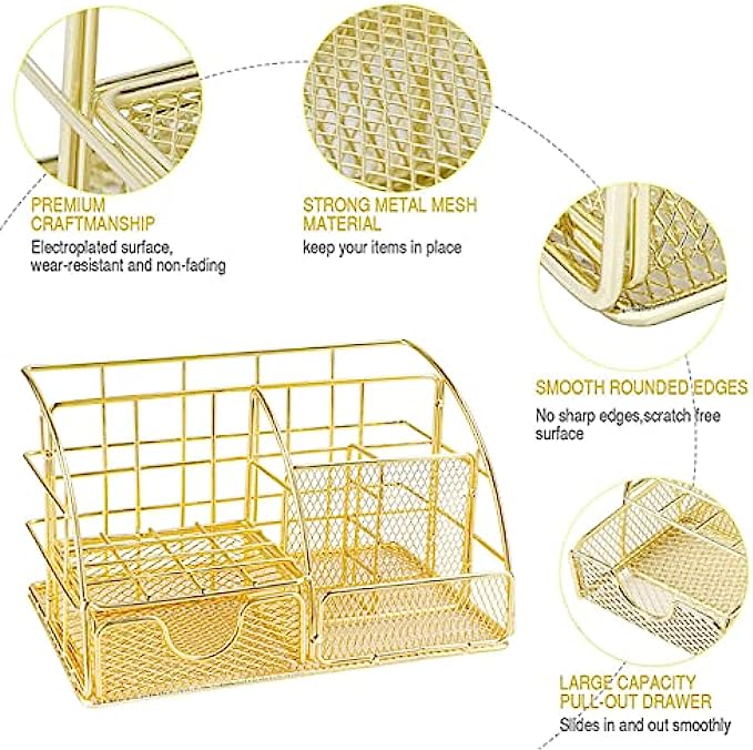 【Elegant Desk Organizers】Our cute and stylish desktop organizer features 5 separate compartments and 1 mini sliding drawer. The desktop organizer is adopting with a powder coat finish and electroplating technology ,wear-resistant, anti-oxidation, and long lasting and does not fade . The rounded corners metal rim and trim add to the visual appeal, and protect your desk.