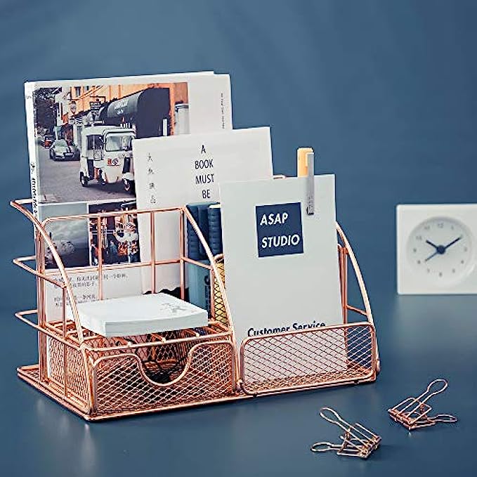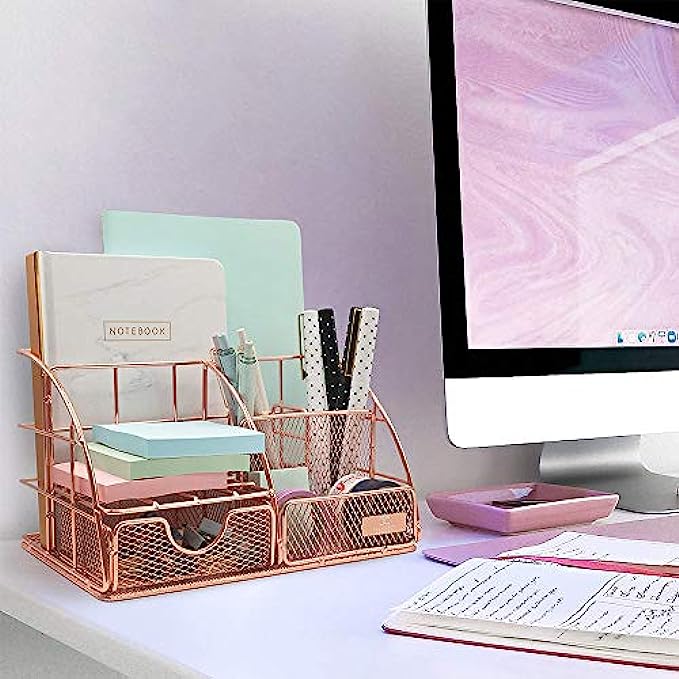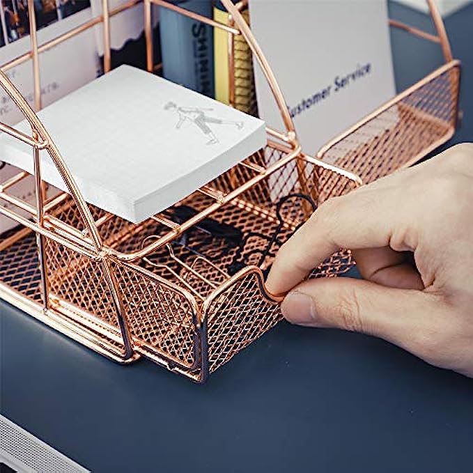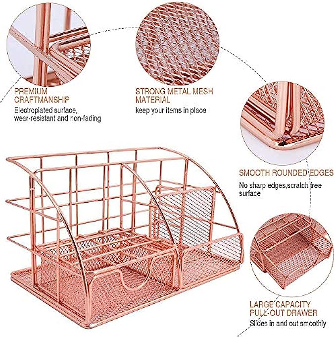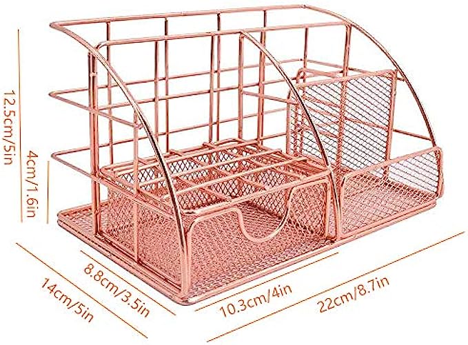 ?【Sturdy & Durable &No Assembly】Made of upmarket iron mesh wire, the all in one desktop organizer is plated with rose gold color. It is anti-oxidation, corrosion-resistance. Its base and rim have been reinforced and will not be easily broken and bent. Mesh design make it not keep dust easily. Easier to clean and sturdier than a plastic one.After you receive the desktop organizer, you can use it directly without installing it.