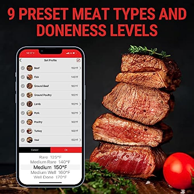 Easy-to-Use, Multifunctional App: Get real-time alerts on the go with the smart thermometer App; Supports custom timer and temperature graphs; USDA-recommended preset temperatures elevate your cooking like a pro every time you fire up your grill with our smoker thermometer