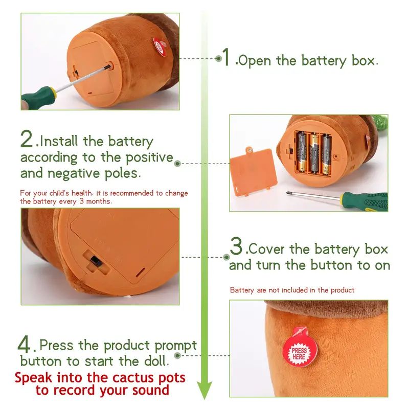 Performance:ok Quality:ok Value For Money:ok Ordered the toy cactus on 15/7 and together with other products, it was delivered to the doorstep on 18/7. It is operated with 3 pcs AA batteries. Can record but cannot be deleted. New recording will auto supersede the old one.