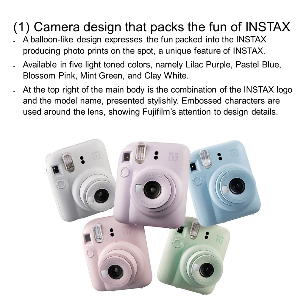 Best Feature(s):easy to use Value For Money:yes Performance:good An improved version of past Instax cameras, this mini 12 looks sleek and is easy to use. Purchase this to use for the company’s giveaway.