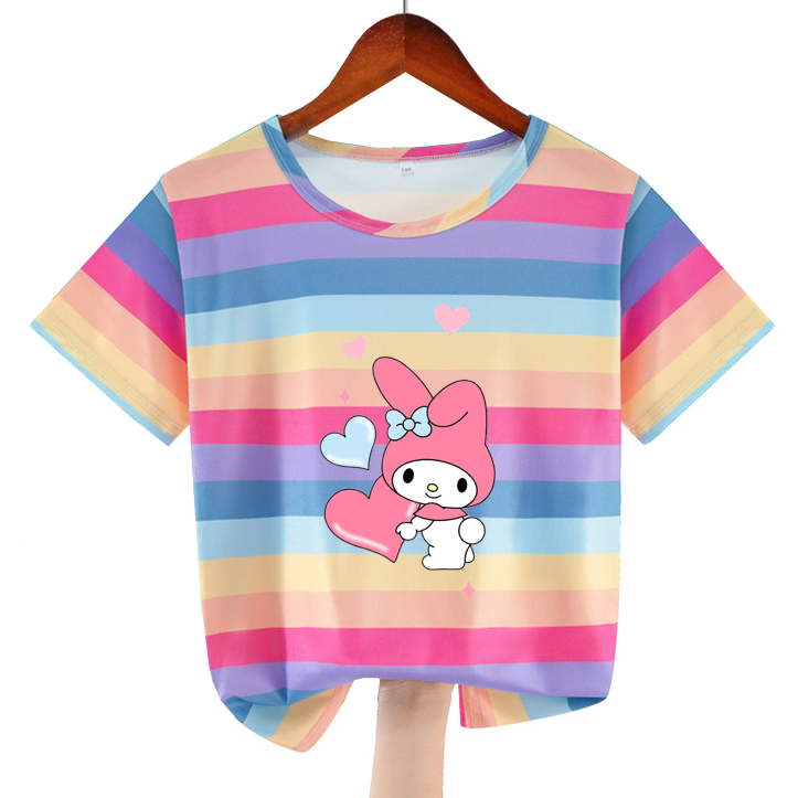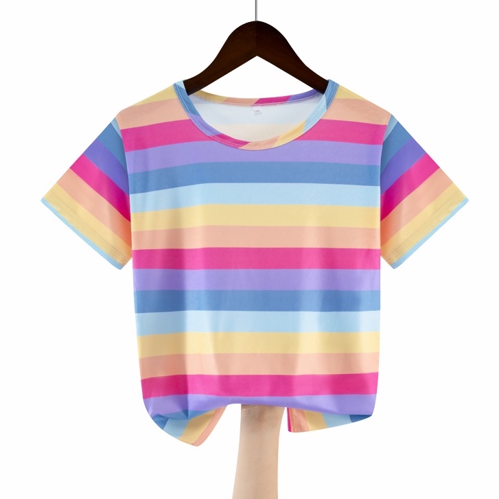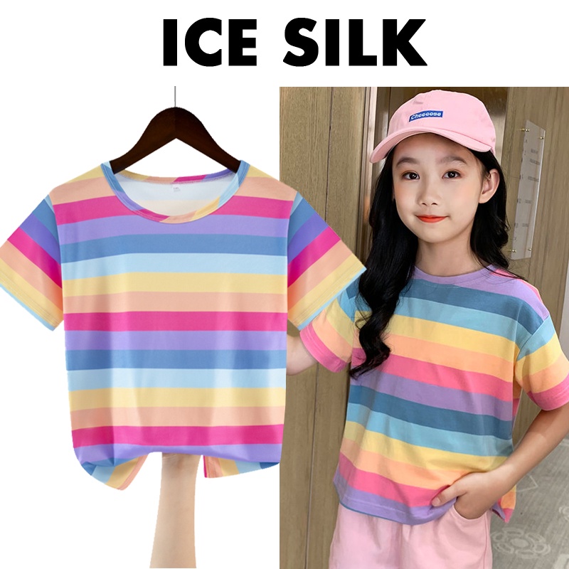Material Quality:stretchable Colour:nice rainbow colour Received the girl rainbow print ice silk T-shirt in good condition. Stretchable material.