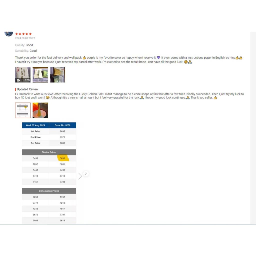 I have received my powerful and lucky golden salt in a very good condition . Thank you seller. This is my first time purchase. I really hope this will bring me good luck. If good, will definitely introduce to all my friends……
