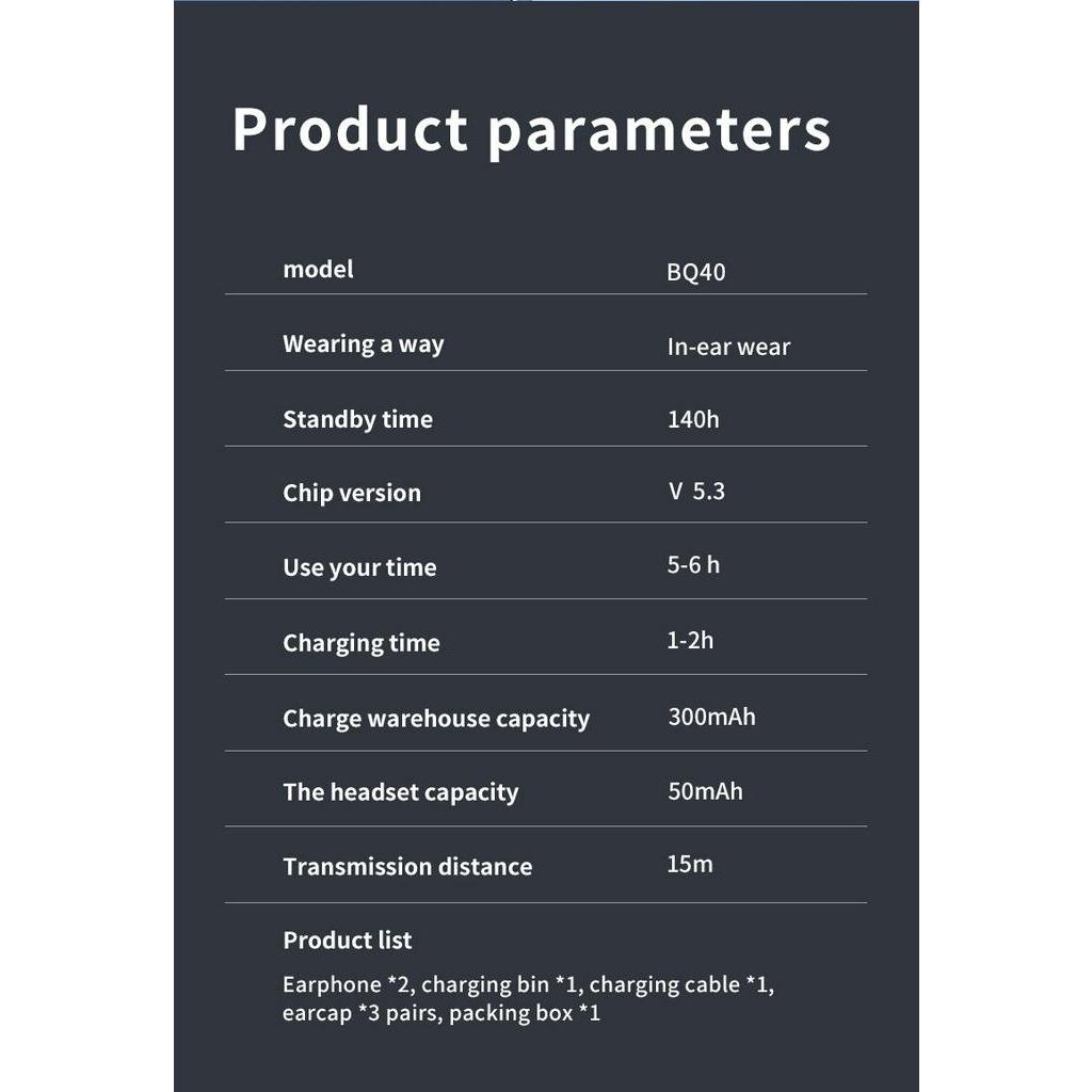 Best Feature(s):? Performance:? Value For Money:? Hi - fi audio , portable true wireless earbuds wireless headset , v 5.3 Bluetooth , bq 40 , made in China , clear and stereo sound , advanced biological diaphragm brings superior sound quality , silver casing , power input dc 5 v , charging time 1 - 2 hours , delivery arrived within a reasonable time frame ,